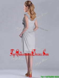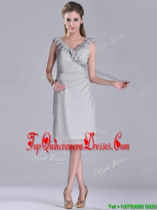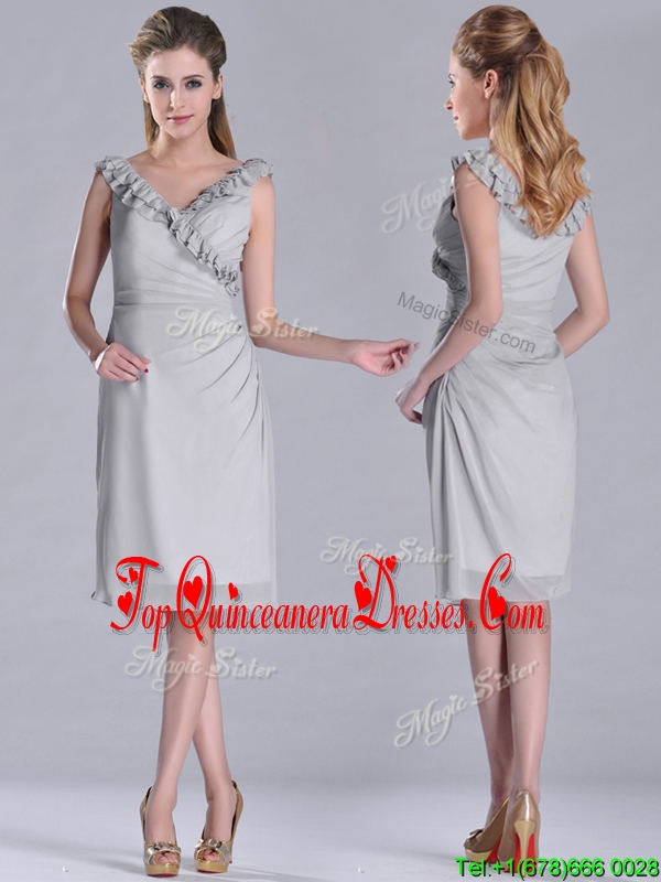 Modest V Neck Grey Chiffon Short Dama Dress with Side Zipper