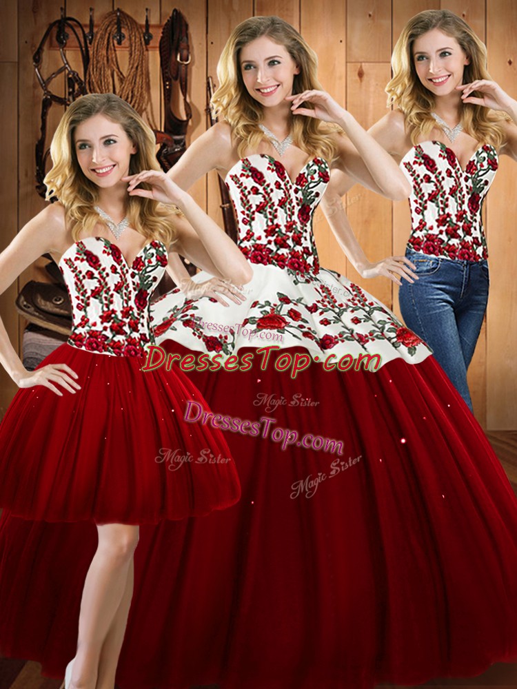 Modest Wine Red Sweetheart Lace Up Embroidery Quinceanera Gown Sleeveless