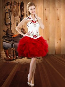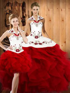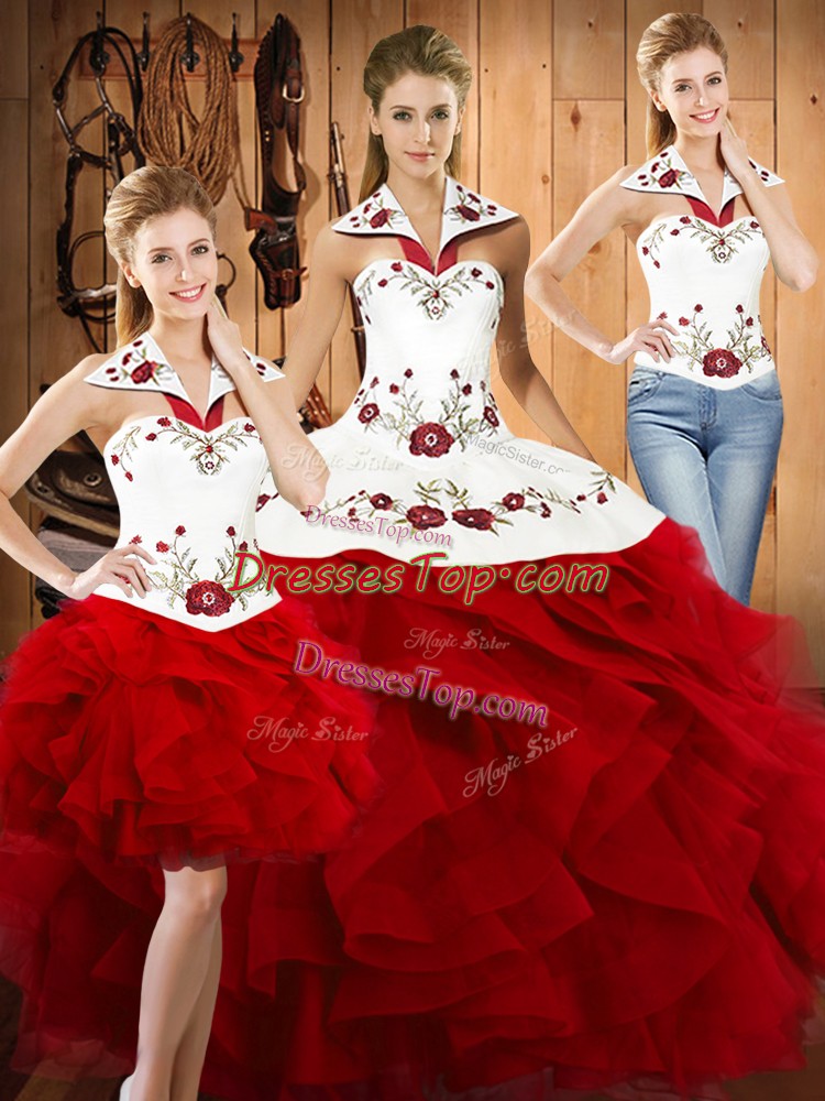 Modest Wine Red Three Pieces Satin and Organza Halter Top Sleeveless Embroidery and Ruffles Floor Length Lace Up Quinceanera Dress