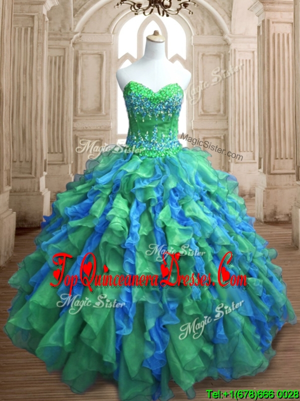 Most Popular Applique and Ruffled Quinceanera Dress in Green and Blue