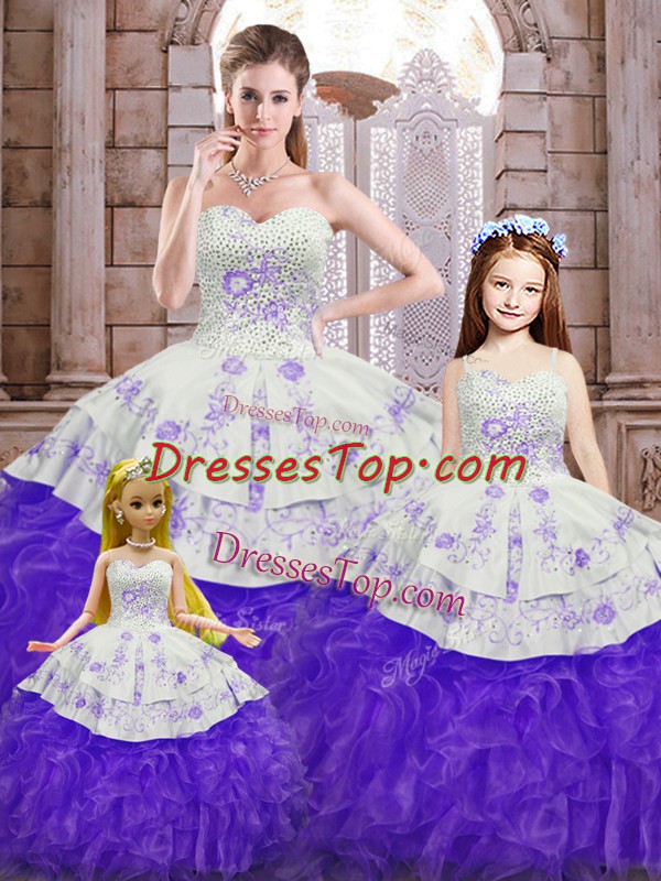 Most Popular Beading and Appliques and Ruffles Quince Ball Gowns White And Purple Lace Up Sleeveless Floor Length