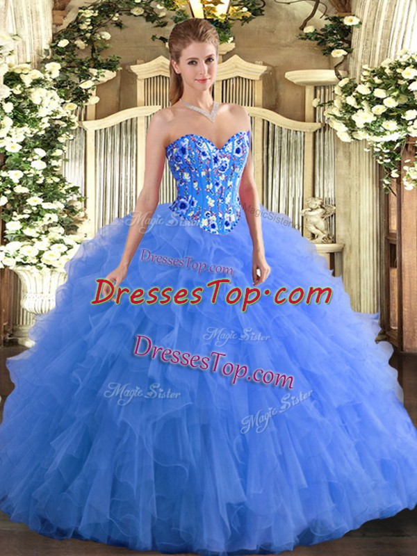 Most Popular Blue Sleeveless Tulle Lace Up Ball Gown Prom Dress for Military Ball and Sweet 16 and Quinceanera