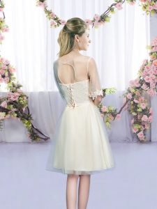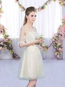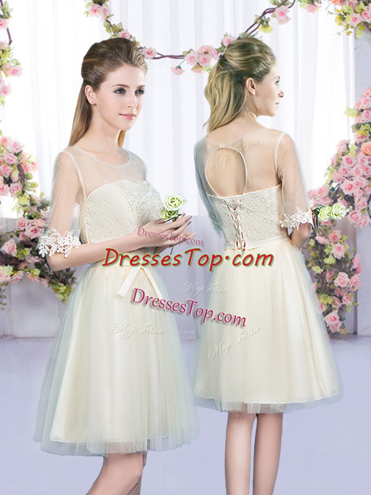 Most Popular Champagne Empire Scoop Half Sleeves Tulle Mini Length Lace Up Lace and Bowknot Court Dresses for Sweet 16