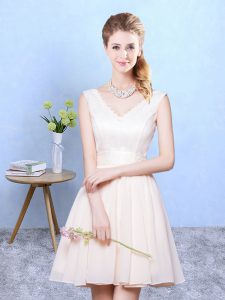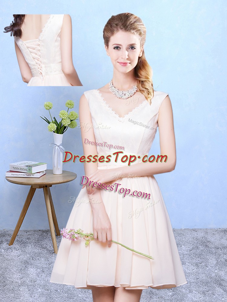 Most Popular Champagne V-neck Lace Up Ruching Quinceanera Dama Dress Sleeveless