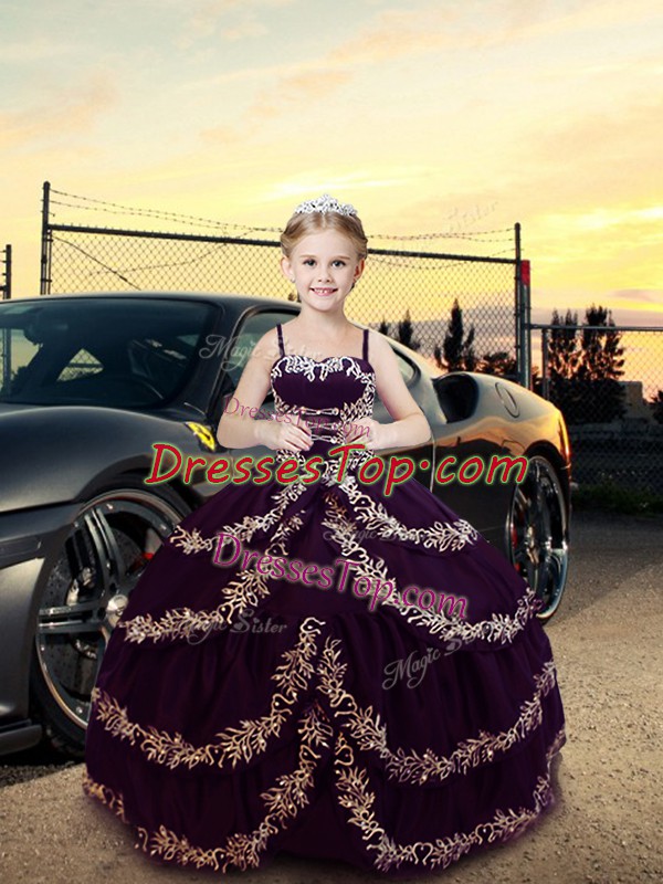Most Popular Dark Purple Sleeveless Embroidery Floor Length Little Girl Pageant Dress