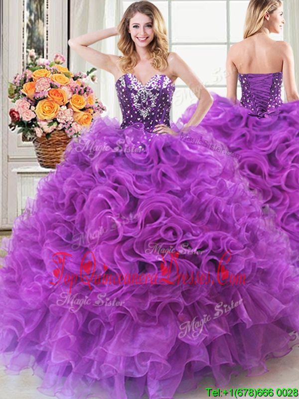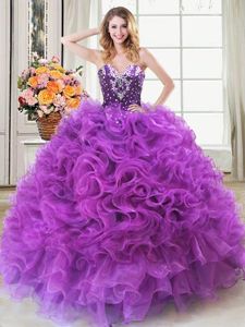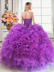 Most Popular Eggplant Purple Ball Gowns Beading and Ruffles 15 Quinceanera Dress Lace Up Organza Sleeveless Floor Length