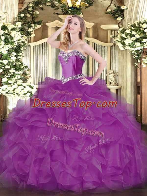 Most Popular Fuchsia Ball Gowns Organza Sweetheart Sleeveless Beading and Ruffles Floor Length Lace Up Quinceanera Dress