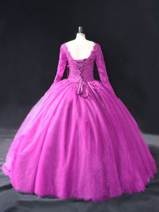 Most Popular Fuchsia V-neck Neckline Lace and Appliques Quinceanera Dress Long Sleeves Lace Up