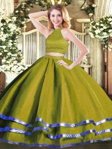 Most Popular Halter Top Sleeveless Quinceanera Gown Floor Length Beading Olive Green Tulle