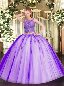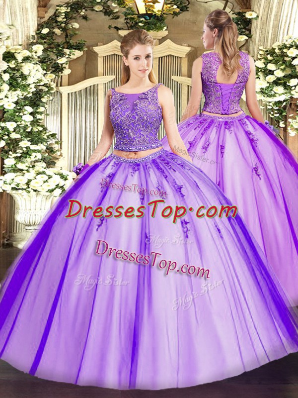 Most Popular Lavender Two Pieces Scoop Sleeveless Tulle Floor Length Lace Up Beading and Appliques Ball Gown Prom Dress