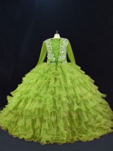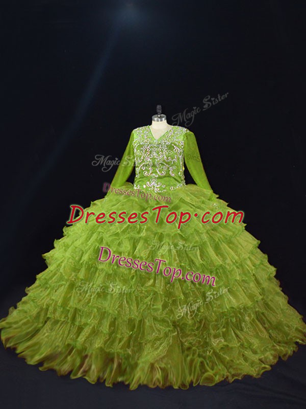 Most Popular Long Sleeves Organza Floor Length Lace Up Quince Ball Gowns in Olive Green with Ruffled Layers