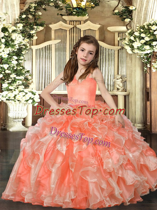 Most Popular Organza Straps Sleeveless Lace Up Ruffles High School Pageant Dress in Peach