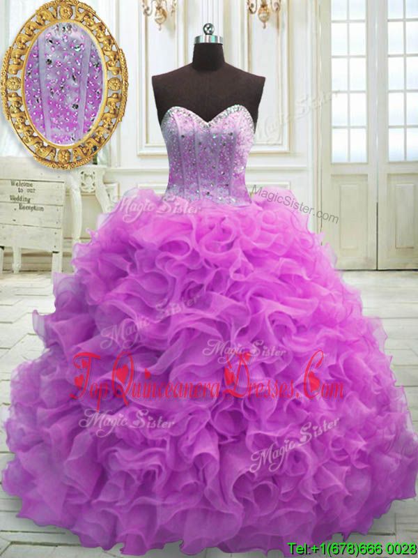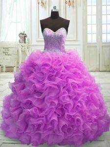 Most Popular Organza Sweetheart Sleeveless Sweep Train Lace Up Beading and Ruffles Vestidos de Quinceanera in Lilac