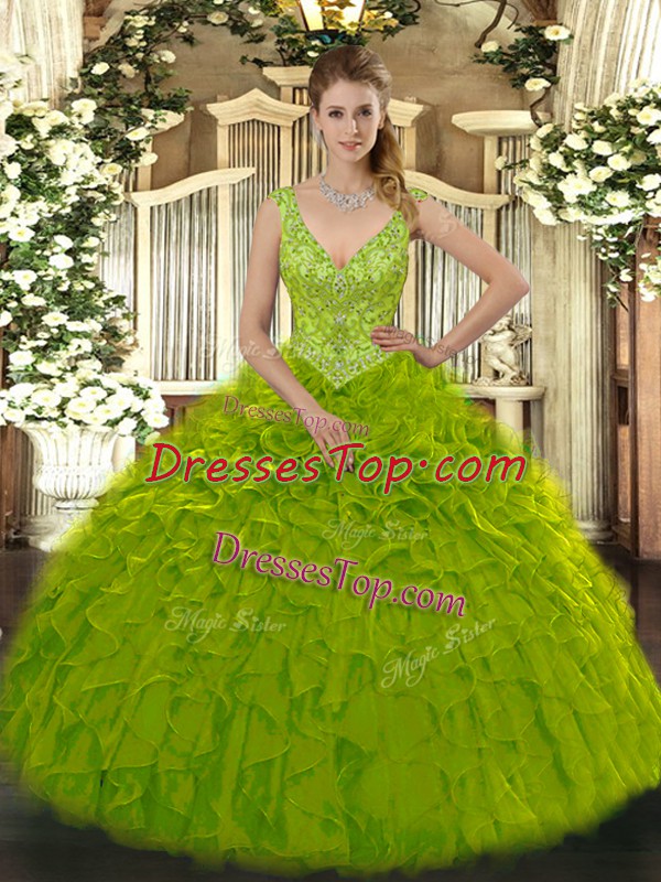 Most Popular Organza V-neck Sleeveless Zipper Beading and Ruffles Ball Gown Prom Dress in Olive Green