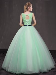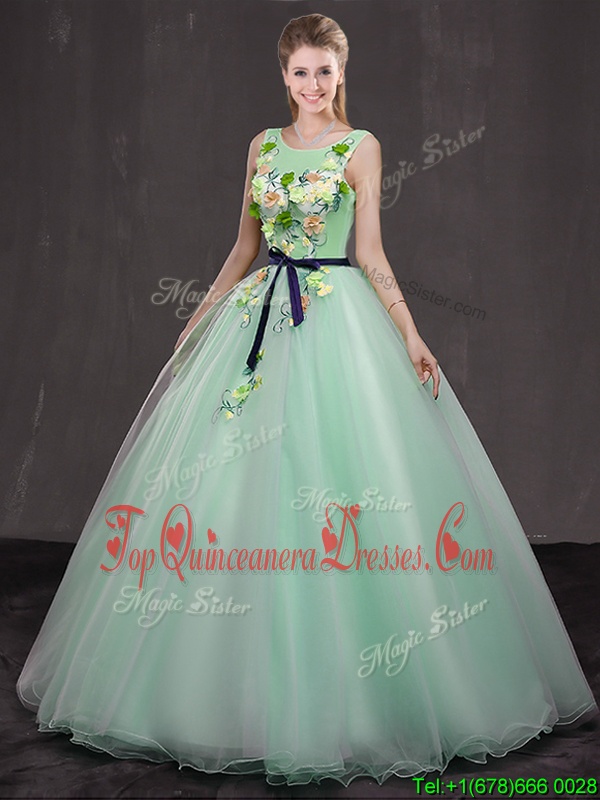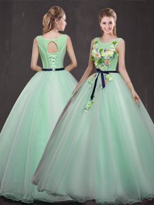 Most Popular Scoop Apple Green Ball Gowns Appliques Quinceanera Dress Lace Up Organza Sleeveless Floor Length