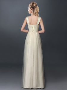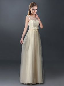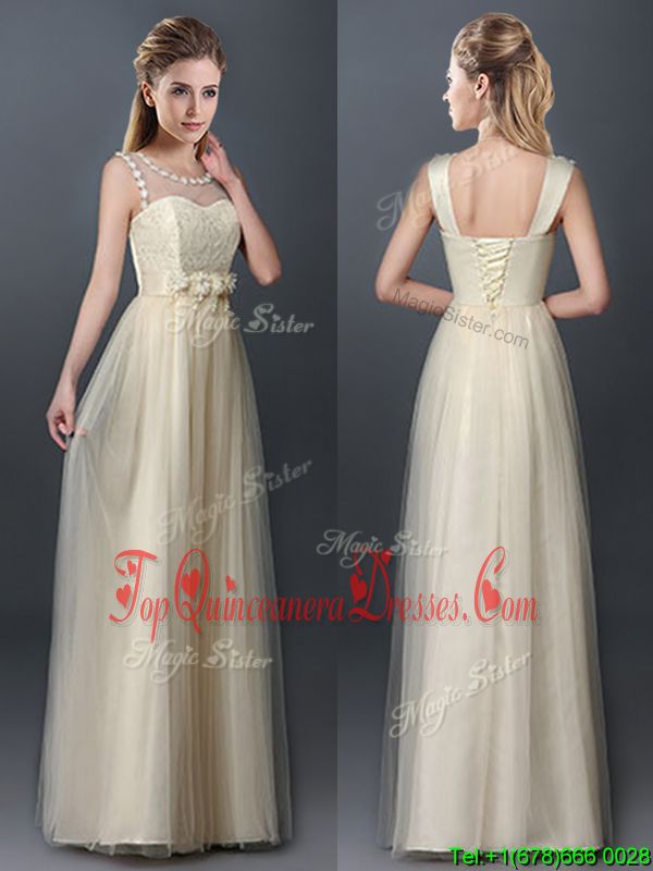 Most Popular Scoop Champagne Sleeveless Tulle Lace Up Damas Dress for Prom and Party and Wedding Party
