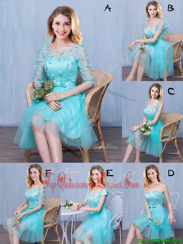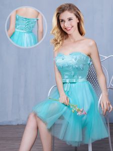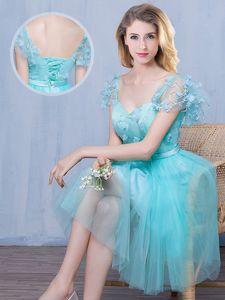 Most Popular Scoop Sleeveless Dama Dress for Quinceanera Knee Length Lace and Appliques and Bowknot Aqua Blue Tulle