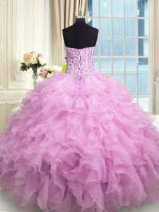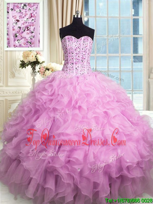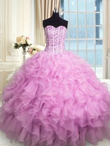 Most Popular Sleeveless Floor Length Beading and Ruffles and Sequins Lace Up Vestidos de Quinceanera with Lilac