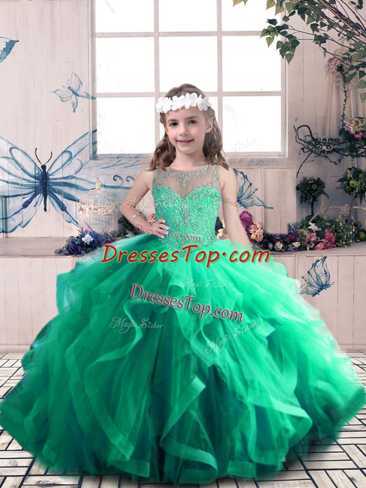 Most Popular Sleeveless Floor Length Beading and Ruffles Lace Up Pageant Gowns For Girls with Green
