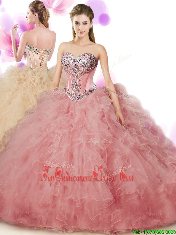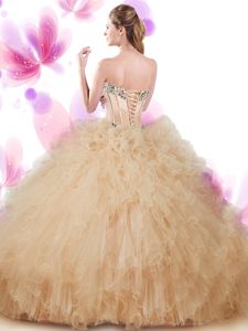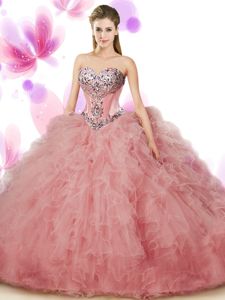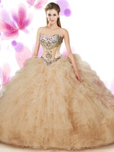 Most Popular Sweetheart Sleeveless Sweet 16 Dresses Floor Length Beading and Ruffles Peach Tulle