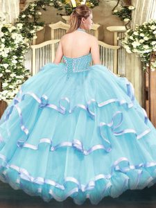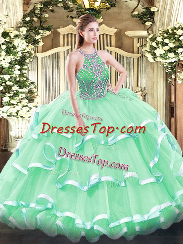 Most Popular Tulle Halter Top Sleeveless Lace Up Beading and Ruffled Layers Sweet 16 Dress in Apple Green