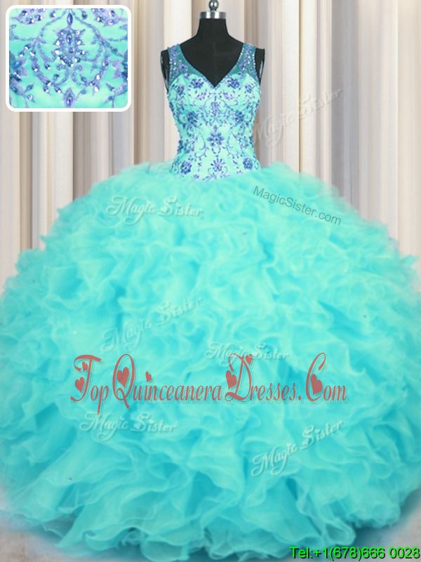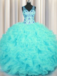 Most Popular V Neck Beading and Appliques and Ruffles 15 Quinceanera Dress Aqua Blue Zipper Sleeveless Floor Length