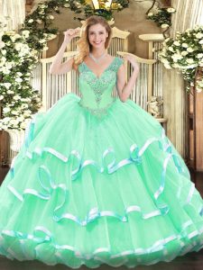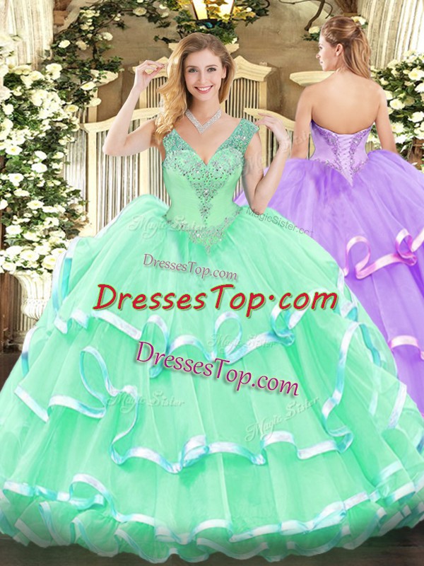 Most Popular V-neck Sleeveless Lace Up Sweet 16 Quinceanera Dress Apple Green Organza