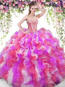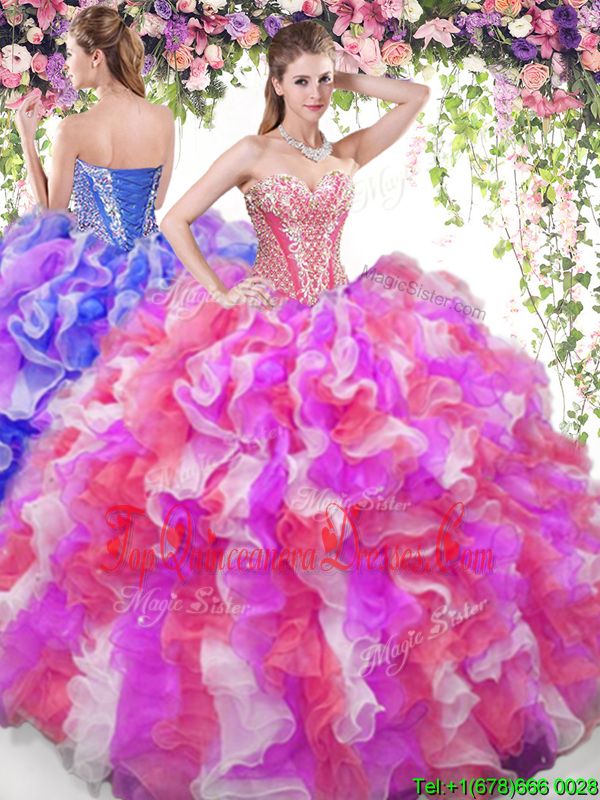 Multi-color Ball Gowns Beading and Ruffles Sweet 16 Dress Lace Up Organza Sleeveless Floor Length