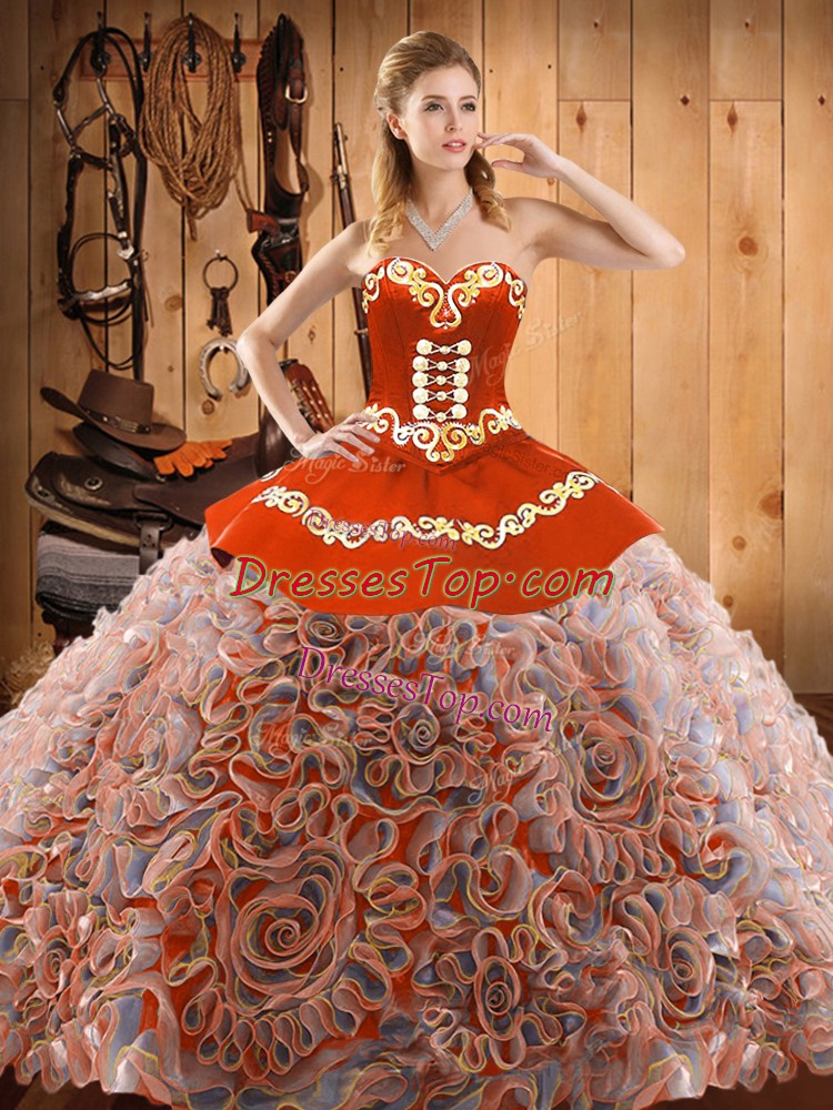 Multi-color Ball Gowns Satin and Fabric With Rolling Flowers Sweetheart Sleeveless Embroidery With Train Lace Up Vestidos de Quinceanera Sweep Train