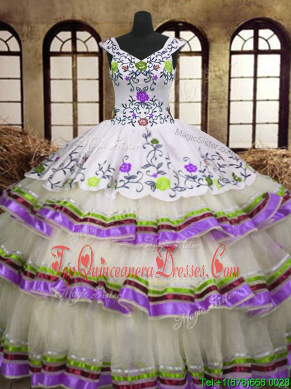 Multi-color Lace Up Quinceanera Dress Embroidery and Ruffled Layers Sleeveless Floor Length