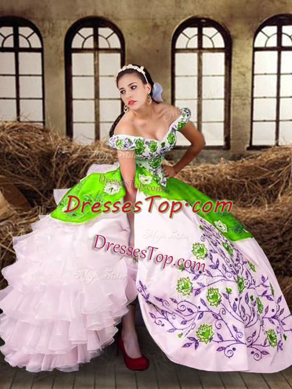 Multi-color Off The Shoulder Neckline Embroidery and Ruffled Layers Quince Ball Gowns Sleeveless Lace Up