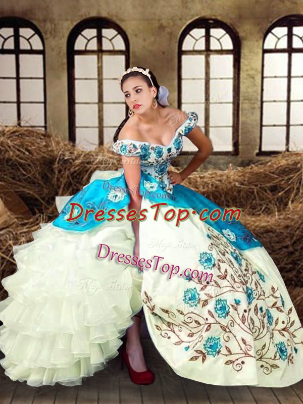 Multi-color Off The Shoulder Neckline Embroidery and Ruffled Layers Sweet 16 Dresses Sleeveless Lace Up