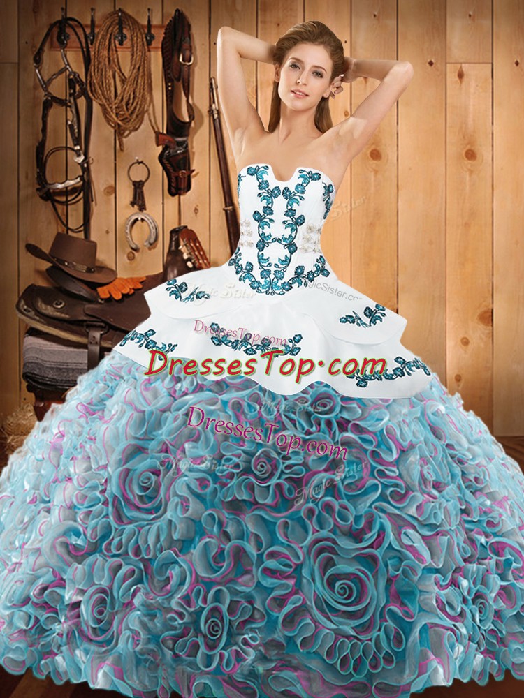 Multi-color Satin and Fabric With Rolling Flowers Lace Up 15th Birthday Dress Sleeveless With Train Sweep Train Embroidery