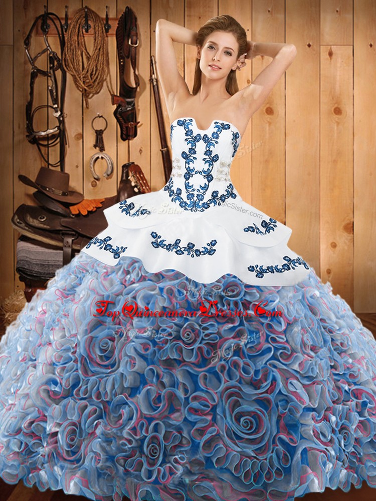 Multi-color Satin and Fabric With Rolling Flowers Lace Up Quinceanera Gowns Sleeveless With Train Sweep Train Embroidery