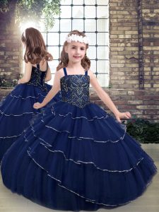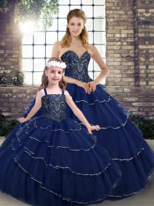 Navy Blue Ball Gowns Sweetheart Sleeveless Tulle Brush Train Lace Up Beading and Ruffled Layers Quinceanera Gowns