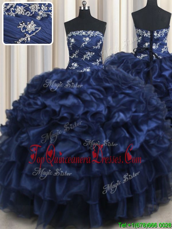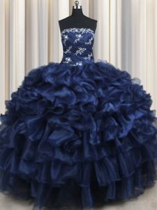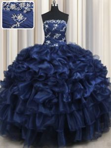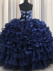 Navy Blue Lace Up Quinceanera Dress Appliques and Ruffles and Pick Ups Sleeveless Floor Length