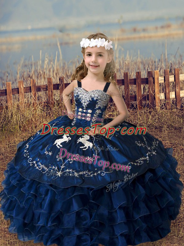 Navy Blue Organza Lace Up Straps Sleeveless Floor Length Girls Pageant Dresses Embroidery and Ruffled Layers