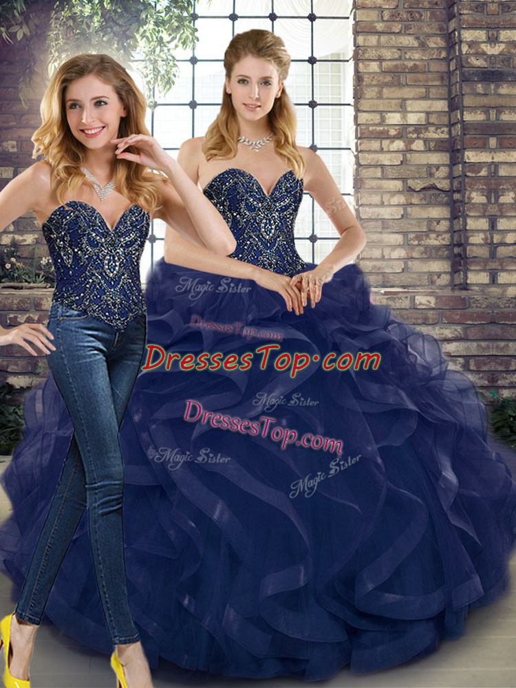 Navy Blue Quinceanera Gowns Military Ball and Sweet 16 and Quinceanera with Beading and Ruffles Sweetheart Sleeveless Lace Up