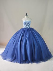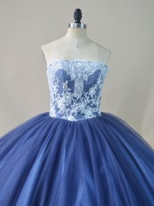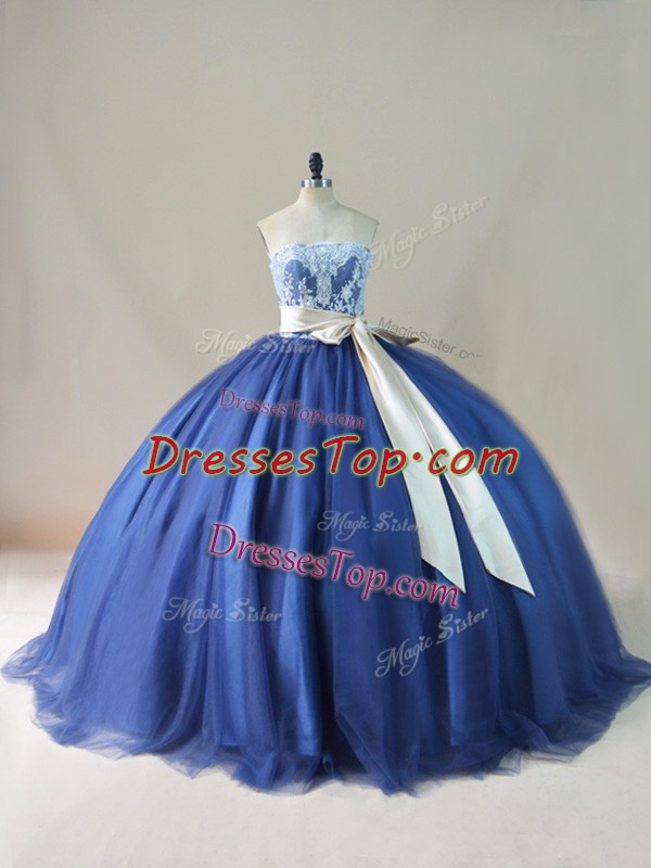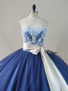 Navy Blue Quinceanera Gowns Tulle Brush Train Sleeveless Appliques and Sashes ribbons and Bowknot