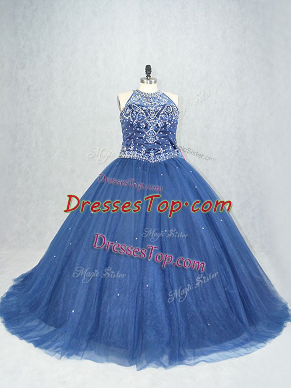 Navy Blue Tulle Lace Up Scoop Sleeveless Quince Ball Gowns Brush Train Beading