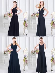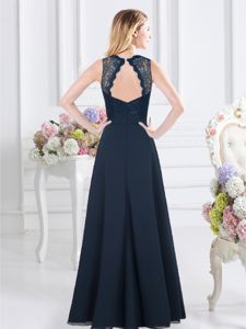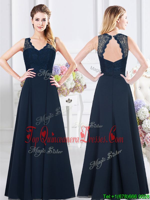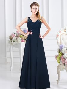 Navy Blue V-neck Neckline Lace and Ruching Damas Dress Sleeveless Backless