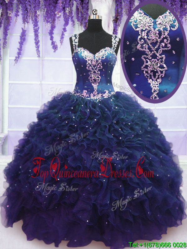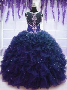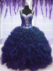 Navy Blue Zipper Straps Beading and Ruffles Quince Ball Gowns Tulle Sleeveless