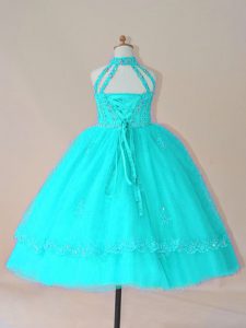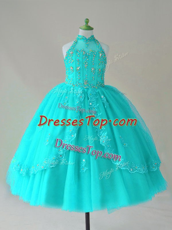 New Arrival Aqua Blue Sleeveless Floor Length Beading and Appliques Lace Up Kids Pageant Dress