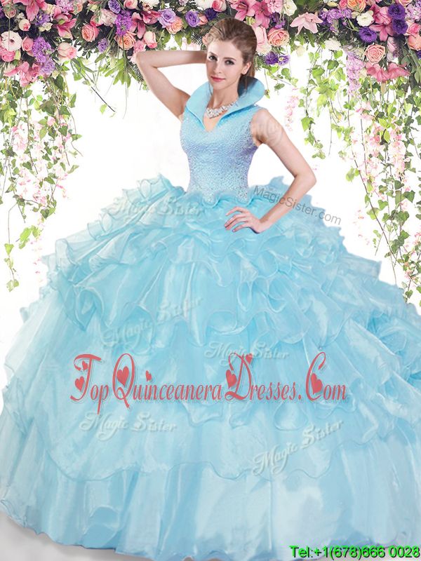 New Arrival Baby Blue Organza Lace Up Quinceanera Dress Sleeveless Floor Length Beading and Ruffled Layers