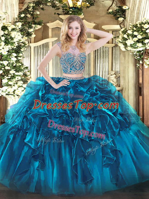 New Arrival Blue Organza Lace Up Scoop Sleeveless Floor Length Ball Gown Prom Dress Beading and Ruffles