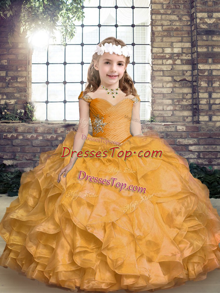 New Arrival Floor Length Gold Kids Pageant Dress Straps Sleeveless Lace Up