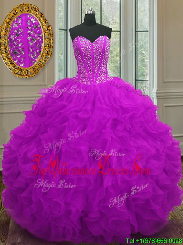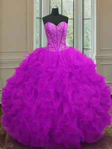 New Arrival Fuchsia Ball Gowns Beading and Ruffles Quinceanera Dresses Lace Up Organza Sleeveless Floor Length