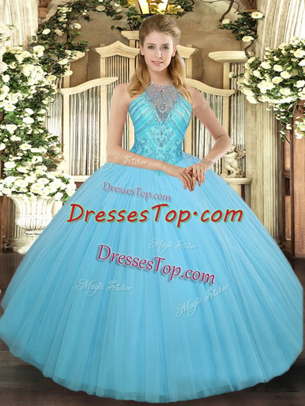 New Arrival High-neck Sleeveless Quinceanera Gowns Floor Length Beading Aqua Blue Tulle