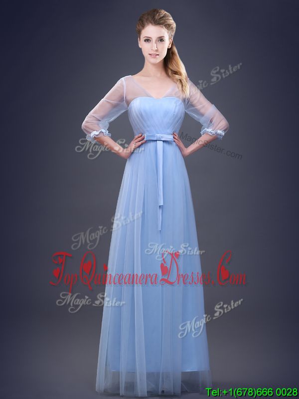 New Arrival Light Blue Empire V-neck Half Sleeves Tulle Floor Length Lace Up Ruching and Bowknot Court Dresses for Sweet 16