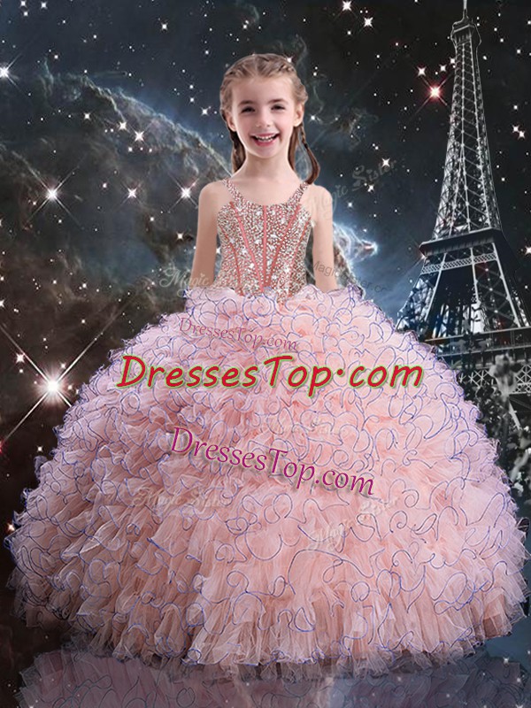 New Arrival Pink Ball Gowns Straps Short Sleeves Organza Floor Length Lace Up Beading and Ruffles Little Girls Pageant Dress